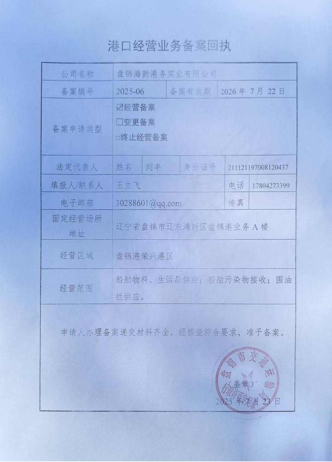附件1 船舶污染清除单位港口经营业务备案复印件