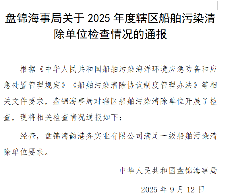 盘锦海韵港务实业有限公司成立于2011年(前身为盘锦海韵燃料油有限公司,2018年变更为盘锦海韵港务实业有限公司)。是船舶污染物接收,港区作业码头防污染监护及海上溢油应急和搜救的专业化公司。交通部海事局核验认定的一级清污资质企业,是盘锦海事局辖区海面防污,清污,应急抢险搜救的主要力量。担负盘锦海域及作业港区的防污染监护,应急清污处置,等相关配套服务,与全国350余家船务公司签订船舶防污染清污协议,2017年,两次为盘锦海域沉船打捞,提供防污染监护。2023年参加辽宁省海上搜救演练。公司注册资金500万元,资产总值3200万元以上,公司员工80余名,(其中海上溢油应急处置高级指挥5人,现场指挥6人,应急处置抢险队员40人)大型应急处置船舶2艘,中小型辅助应急处置船舶8艘,大中型海上溢油回收设备8台套,各种应急物资充足,能够保障盘锦海域海上溢油处置的供应。公司始终如一地将保护海洋环境为己任!是美丽海湾的倡导者,碧海盘锦的践行者!
