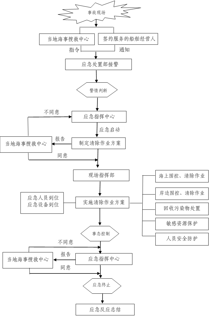 船舶污染事故是突发性环境污染事故,任何堵漏、围控及污染清除应急行动,应急反应时效性是衡量公司应急清污能力的重要指标;公司的应急处置船在24小时待命的前提下,接到签订污染清除协议的船舶经营人的应急清污通知、发现服务区域内船舶或其有关活动造成或可能造成海洋环境污染、接到盘锦海事局的应急清污指令,将立即启动本公司《防治船舶及其有关作业活动污染海洋环境应急预案》(以下简称“《应急预案》”),立即出动辖区清污分队到达事故现场。