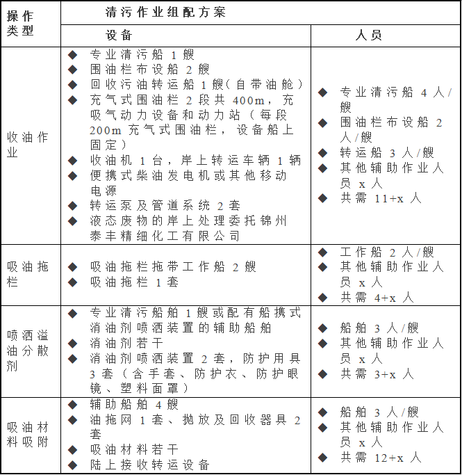 (1)公司应急指挥中心在启动本预案的同时,根据服务区域环境特点、船舶污染物泄漏和预测扩散情况,制定污染物清除对策。本节仅对污染物清除作业提出以下原则性要求,污染清除作业方案。应急清除作业方案,需报盘锦海上搜救中心审查同意后,方可实施。