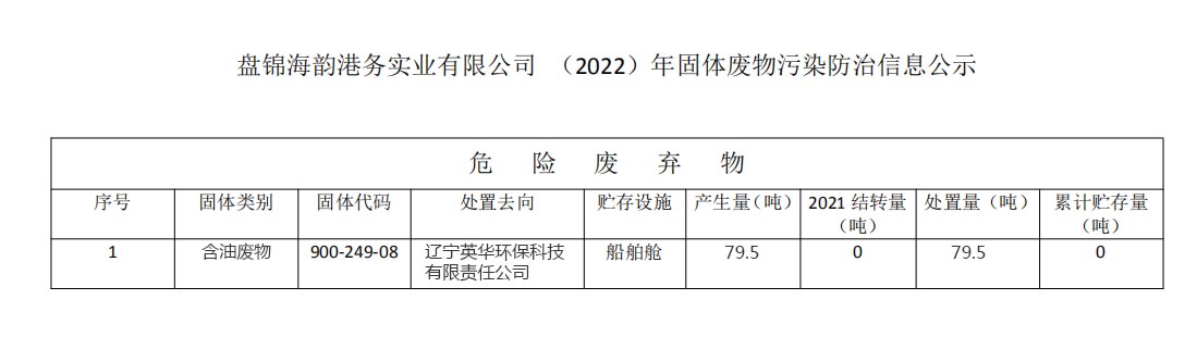 盘锦海韵港务实业有限公司固体废物污染防治信息公司